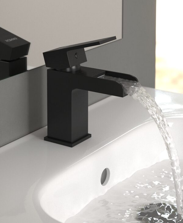 Contemporary open channel design,Minimum operating pressure: 0.2 bar,Manufactured from brass,Black finish,Ceramic disc technology,Click clack basin waste included,Suitable for the following systems: Gravity fed; Pumped; Unvented or Combi Systems, ,*5 Year Guarantee,*5 Year Guarantee on Taps and Showers applies to chrome finishes and main body of products.All taps and showers must be cleaned with warm soapy water and soft cloths only.The use of abrasive cleaners or materials will render warranty invalid.